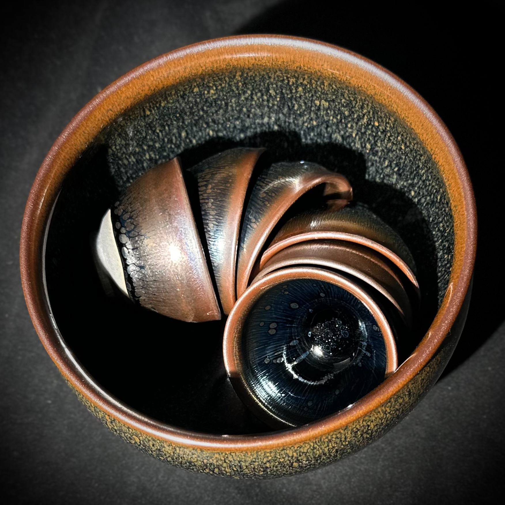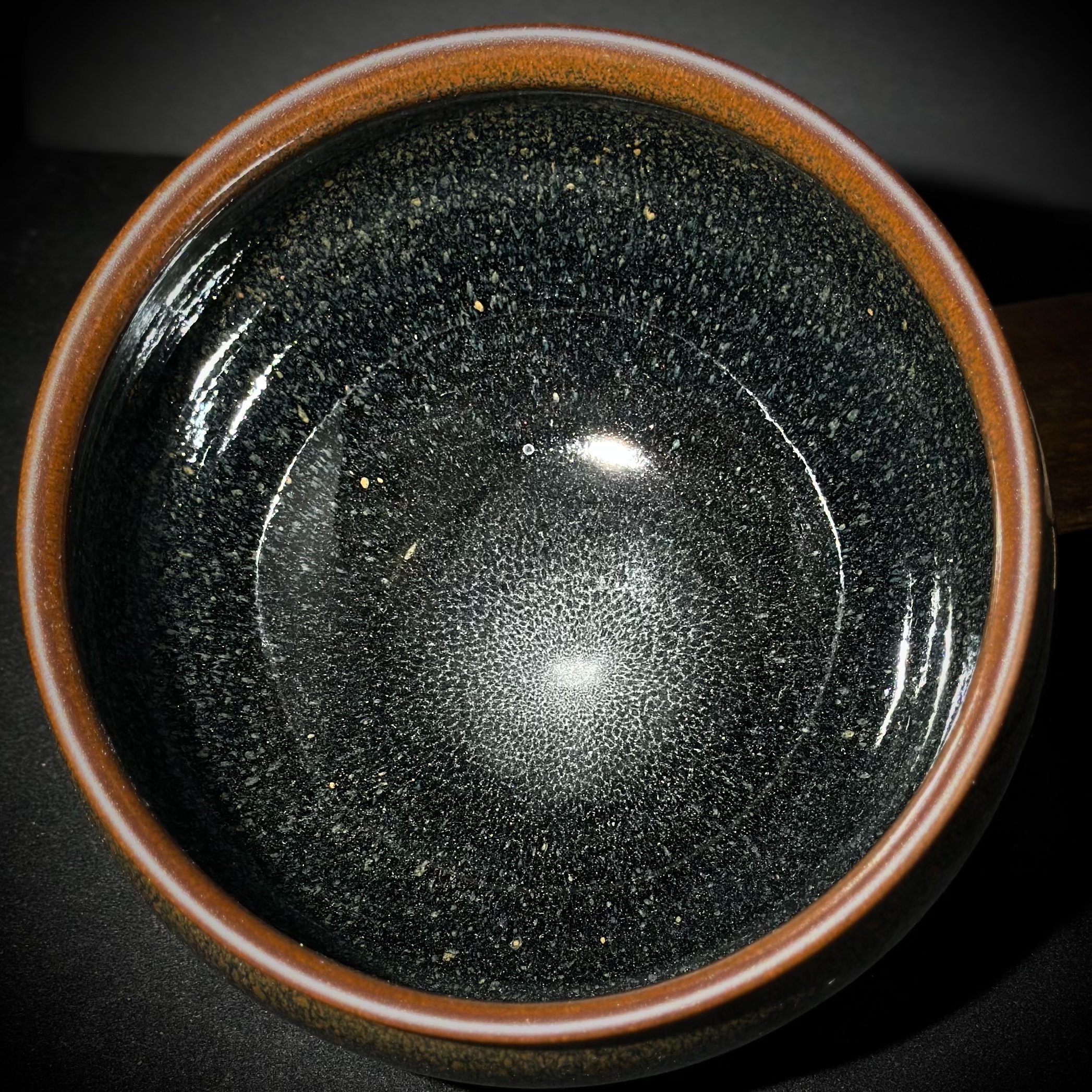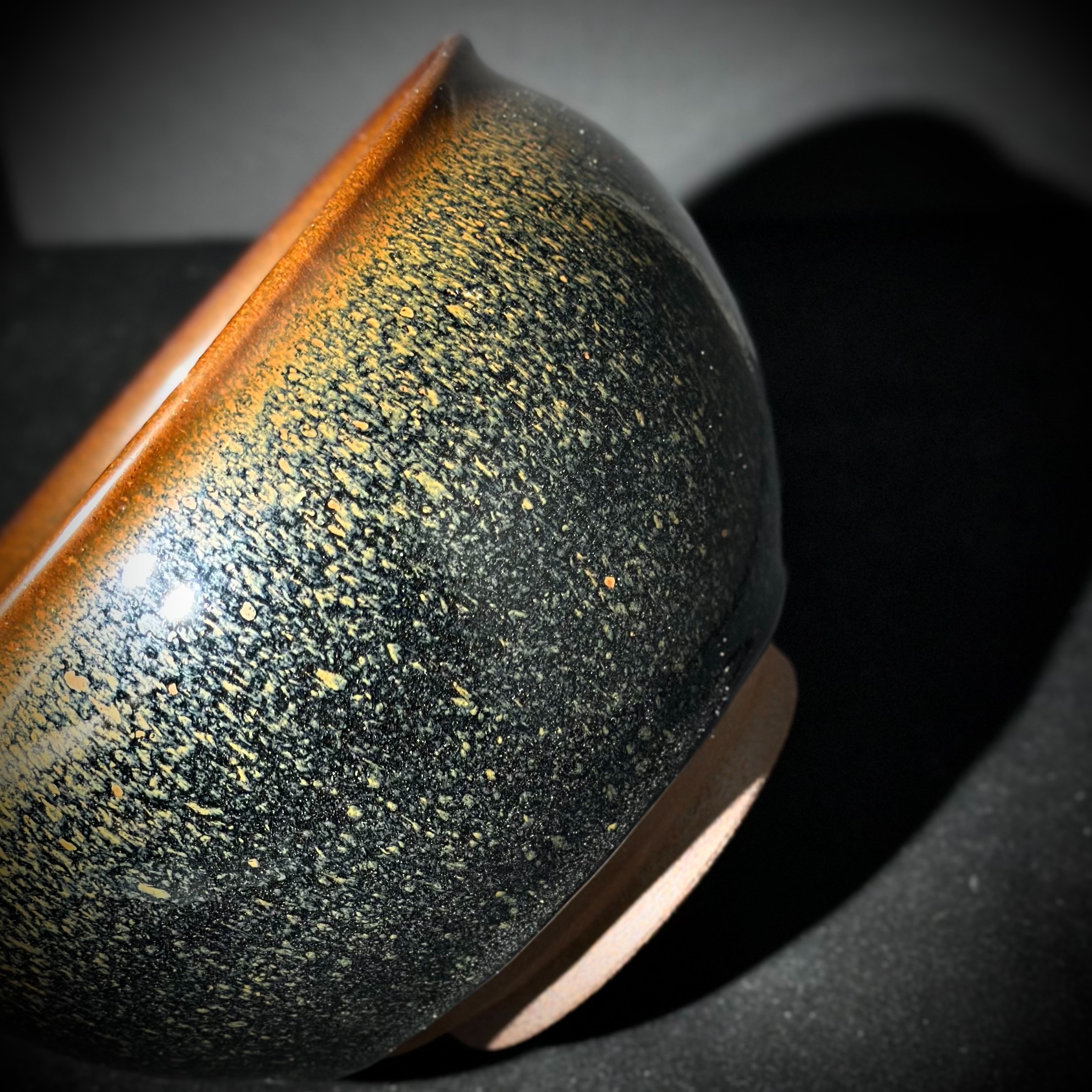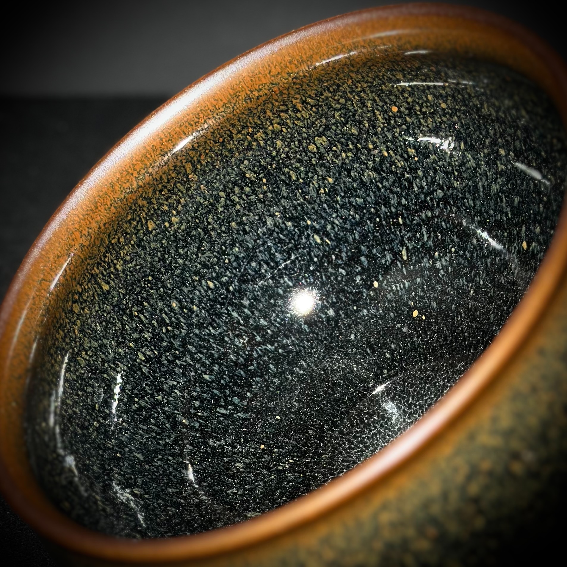 通體以青鷓鴣釉面為主調,黑釉底中浮現層層斑點