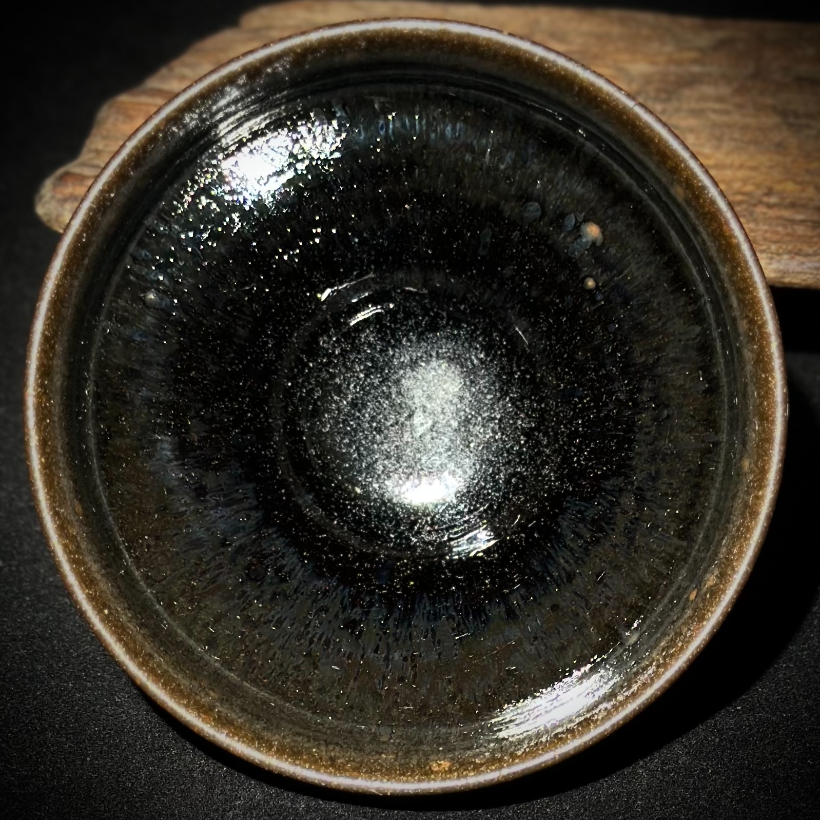初看外壁,黑釉為底,銀點閃爍,似鷓鴣鳥羽毛上的斑點